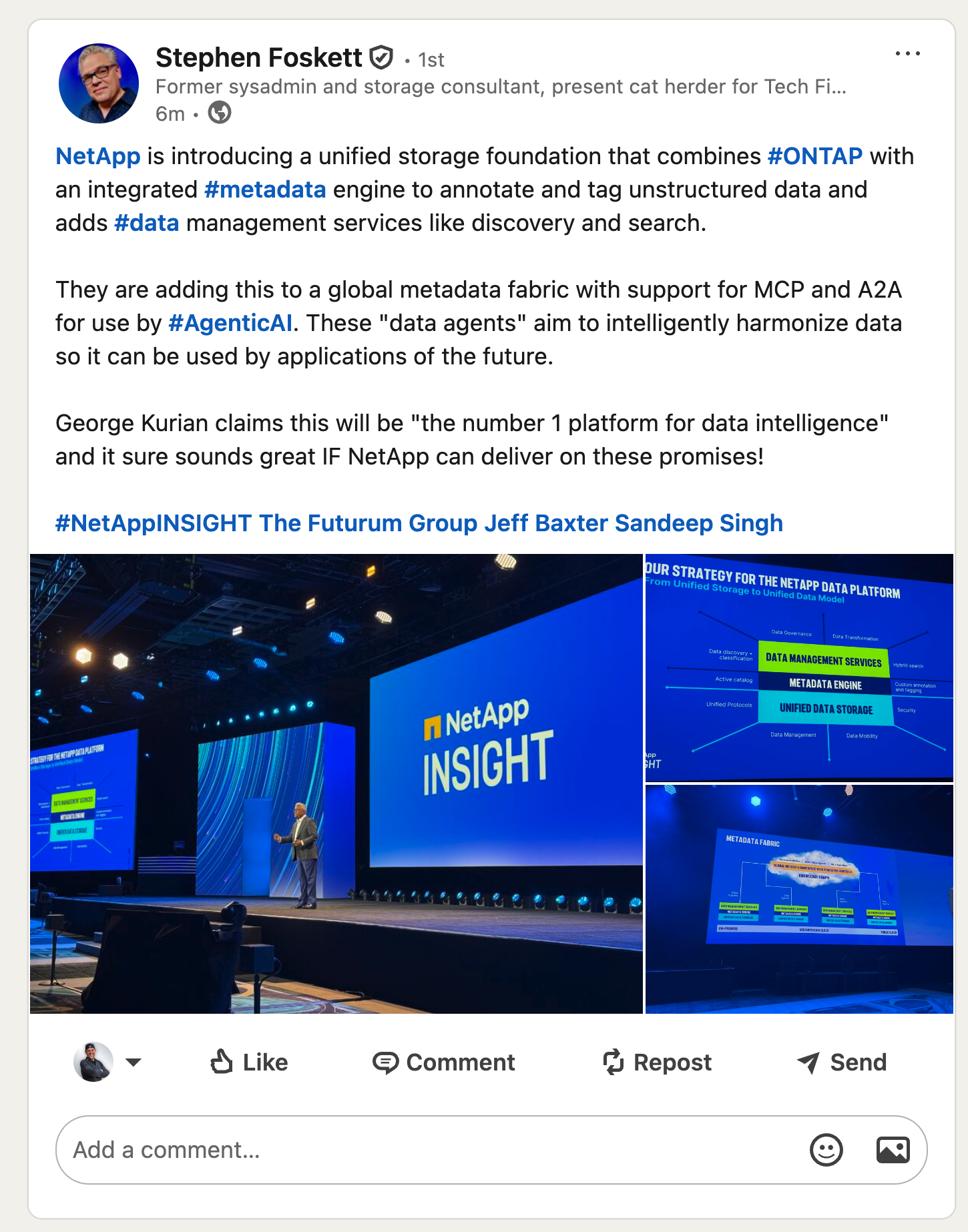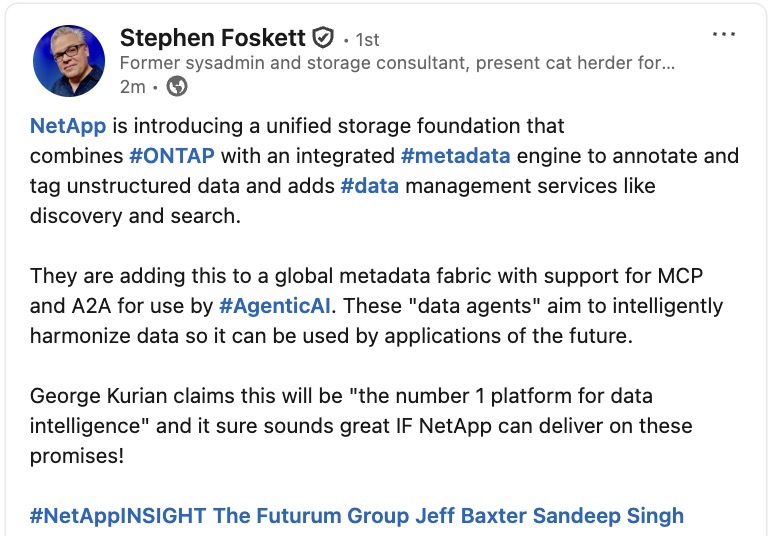 Live Blog: https://t.co/VScRTglH2x@SFoskett #NetAppINSIGHT #NetApp #AI #DataInfrastructure #CloudComputing #AIML #GenerativeAI #AgenticAI #DataModernization pic.twitter.com/9r8H9JMzJM