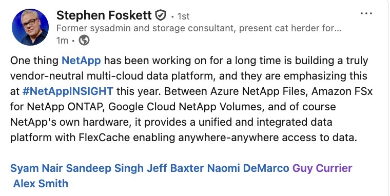 NetApp long been working on a vendor-neutral multi-cloud data platform, and this continues at #NetAppINSIGHT.Azure NetApp Files, Amazon FSx for NetApp ONTAP, Google Cloud NetApp Volumes, and NetApp hardware. A unified and integrated data platform with FlexCache enabling anywhere-anywhere access.