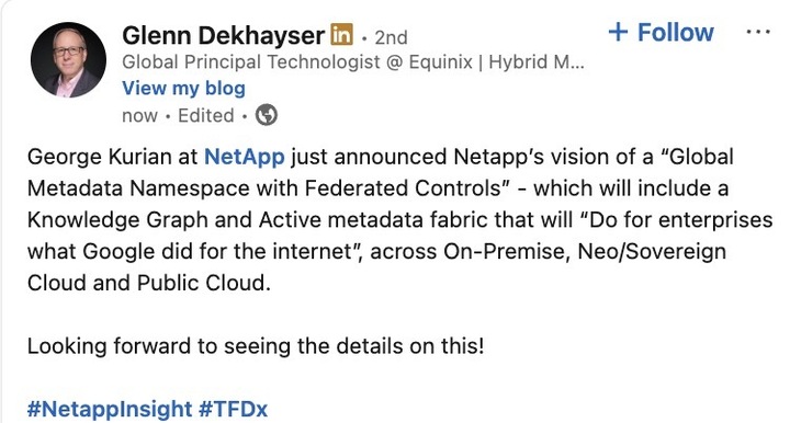 NetApp is bringing a metadata engine for ONTAP to keep the active metadata updated and available for AI. #NetAppInsight #TFDx