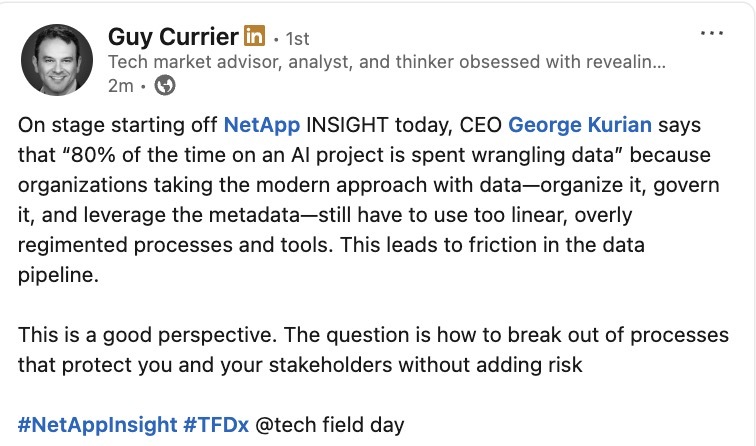 Starting off NetApp INSIGHT today at the morning keynote, CEO George Kurian calls this “the era of data-enabled intelligence” and says the data challenge is that “80% of the time on an AI project is spent wrangling data”#NetAppInsight #TFDx @techfieldday.com