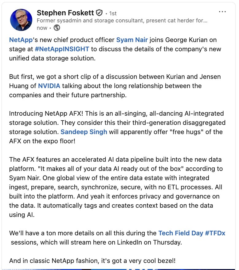 A poem and an offer to hug NetApp's new AFX (disaggregated storage platform purpose built for AI) aren't things I would had on my Keynote bingo card.Kinda quirky and I'm here for this. #netappinsight