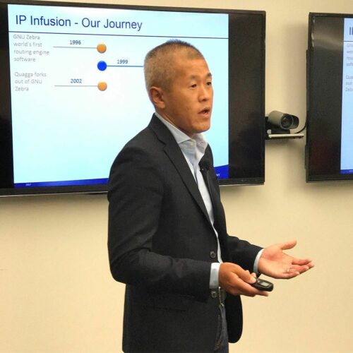 Atsushi Ogata, President and CEO of IP Infusion, introduces the company to the delegates. IP Infusion was founded in 1999 and makes ZebOS, a comprehensive standards-based Layer 2, Layer 3, and MLPS network platform. The company has also expanded into making a disaggregated networking solution.