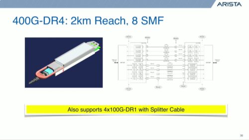 Andy Bechtolsheim, Founder, Chief Development Officer and Chairman at Arista, reviews how Arista is preparing for the 400 Gigabit future. While 100G Ethernet is gaining ascendency now, by 2021 he sees the 400G port numbers reaching parity with 100G Ethernet. The optics for this will be powered by 100G per lane, as defined by the […]