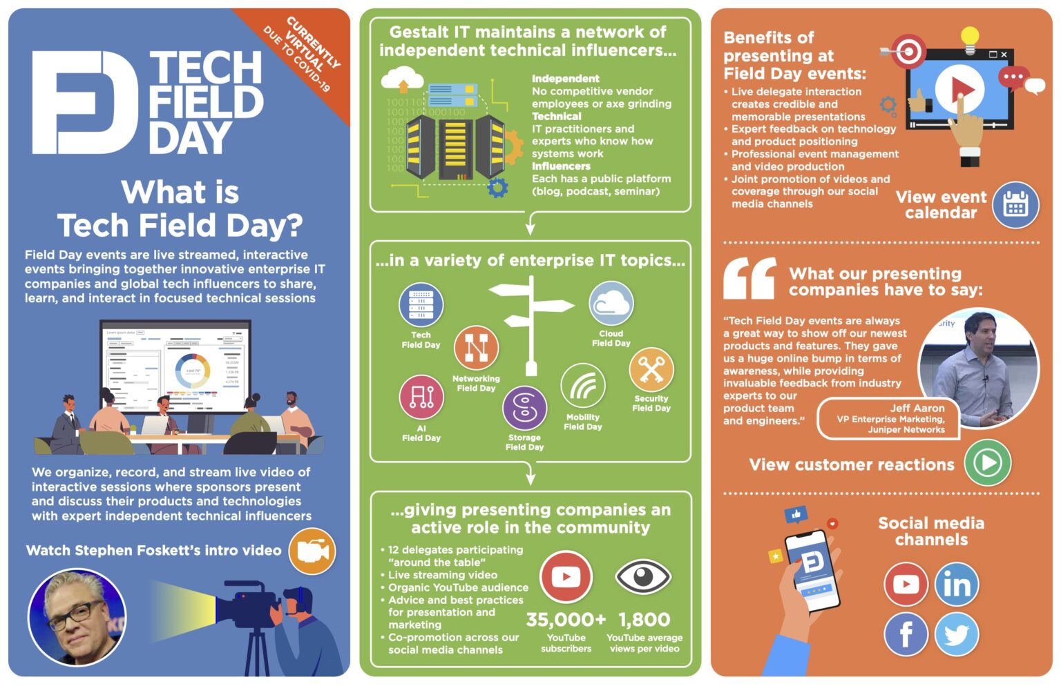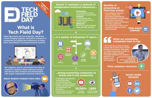 Tech Field Day was created in 2009 to bring together innovative IT product vendors and independent thought leaders to share information and opinions in a presentation and discussion format. Since then, the event series has evolved to produce over one hundred events. In additional to the classic Tech Field Day, we now produce events focusing on specific enterprise verticals, including Cloud, Mobility, Networking, Security, and Storage.